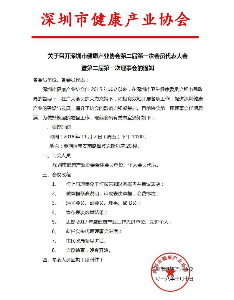 關于召開深圳市健康產業協會第二屆第一次會員代表大會暨第二屆第一次理事會
