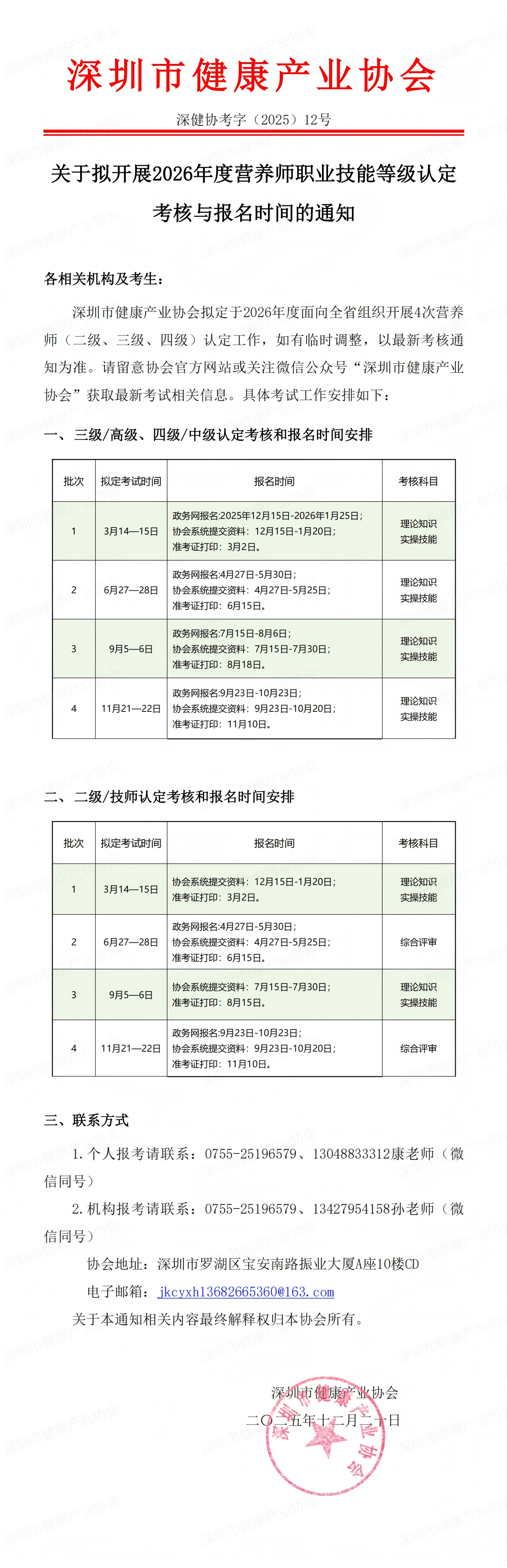 2026年度營養師職業技能等級認定考核與報名時間通知