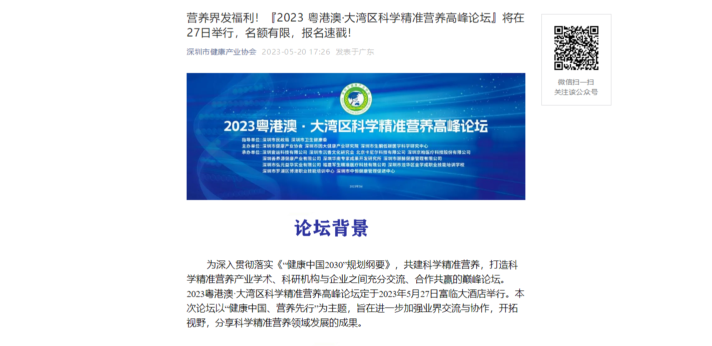營養界發福利!『2023 粵港澳·大灣區科學精準營養高峰論壇』將在27日舉行,名